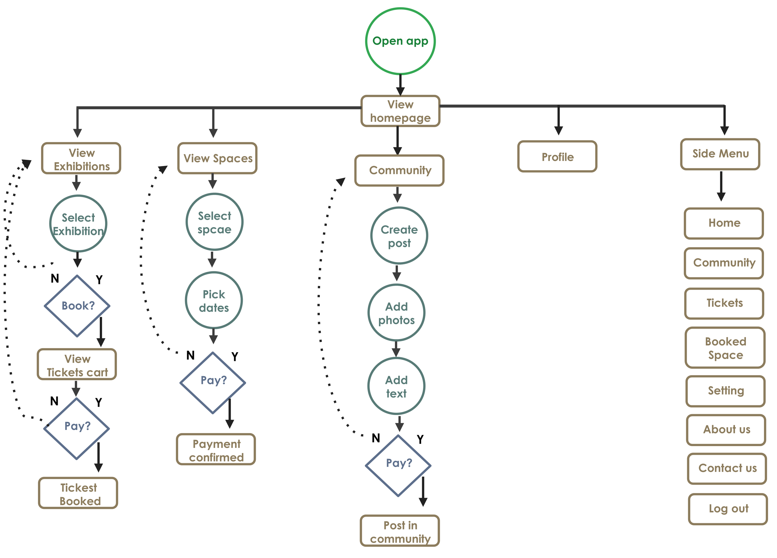 A user flowchart showing the main paths and interactions within the app. This diagram helps define the navigation structure and ensure a seamless user experience.