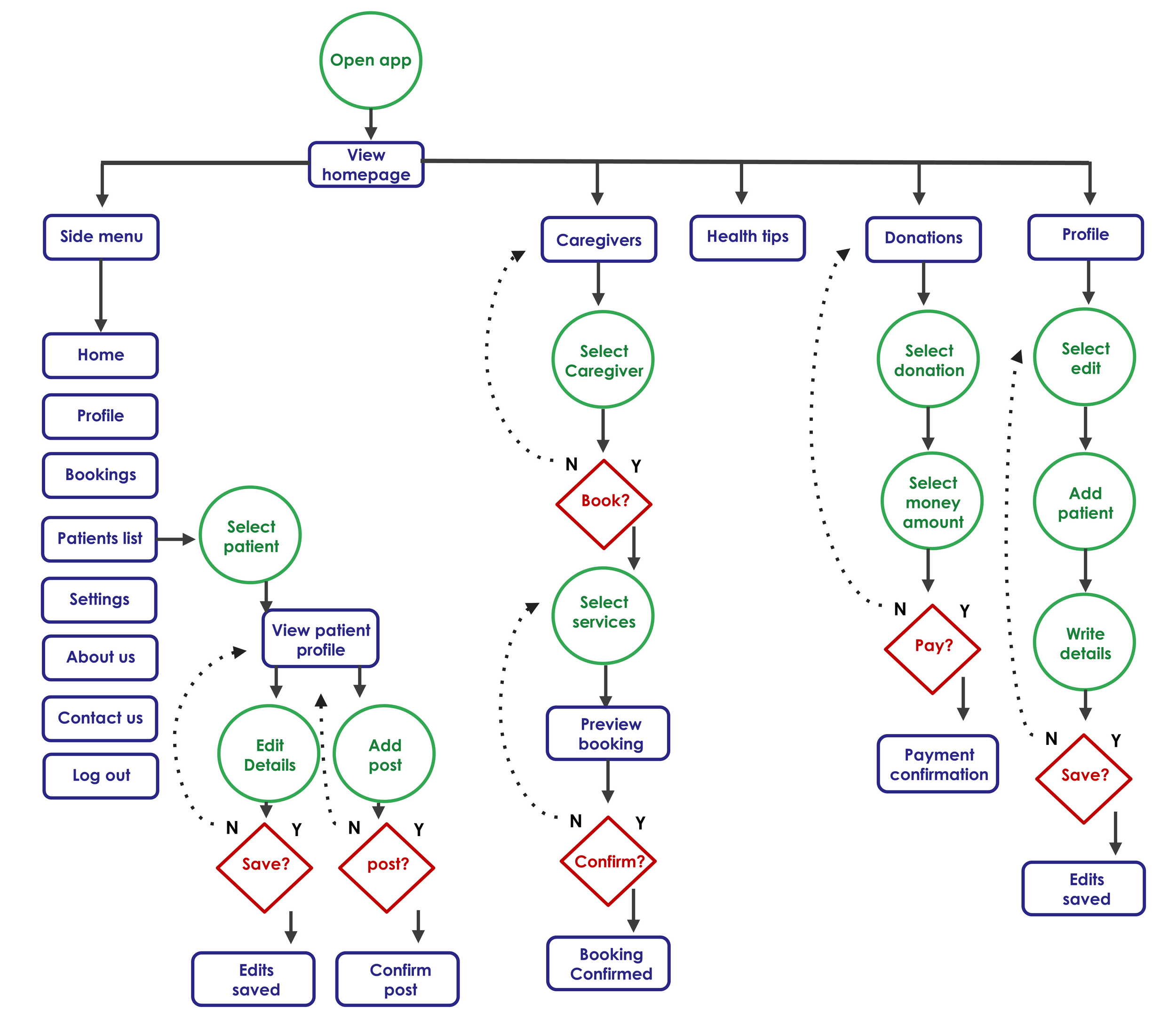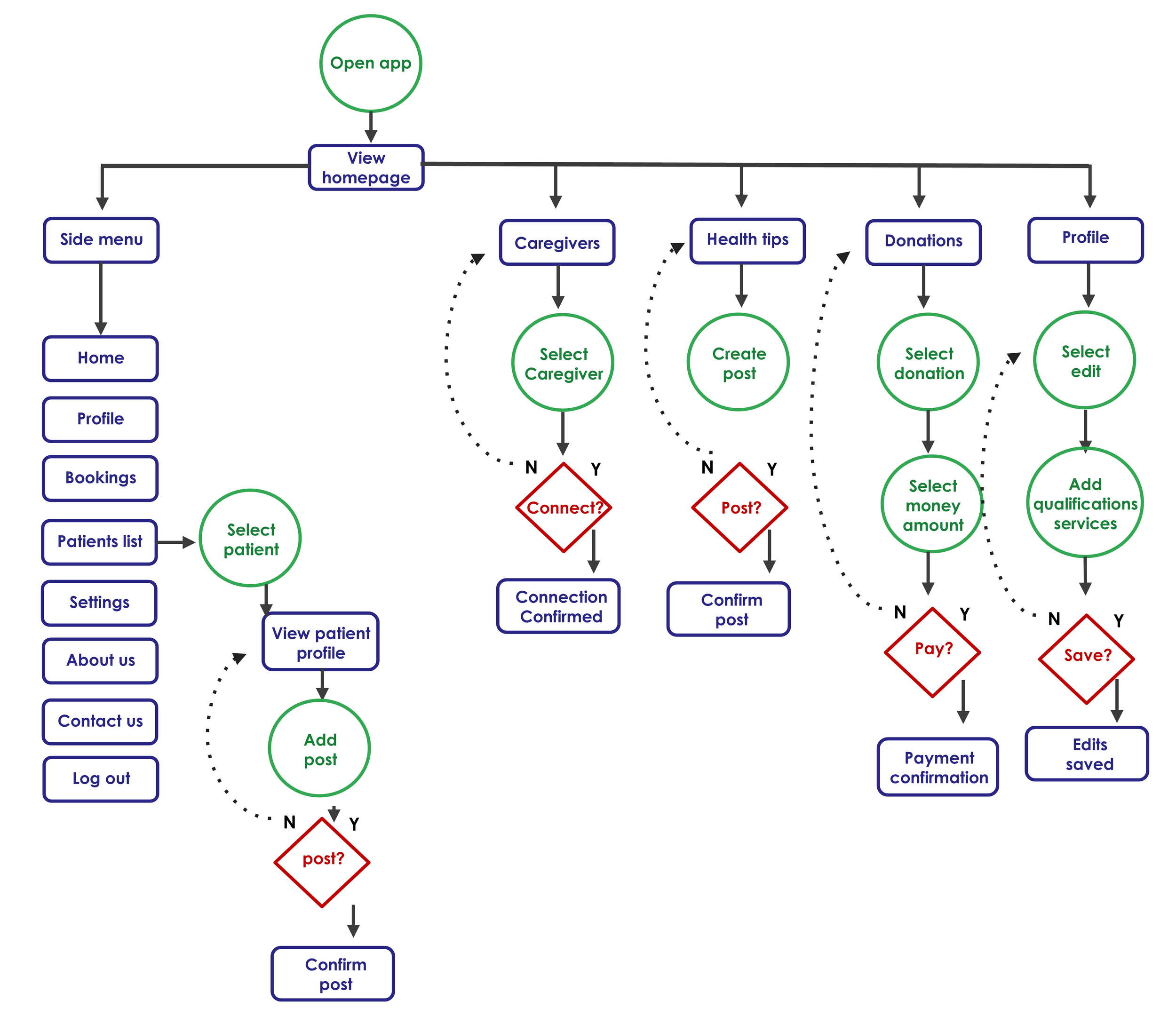 user flowchart showing the main paths and interactions within the app. This diagram helps define the navigation structure and ensure a seamless user experience.